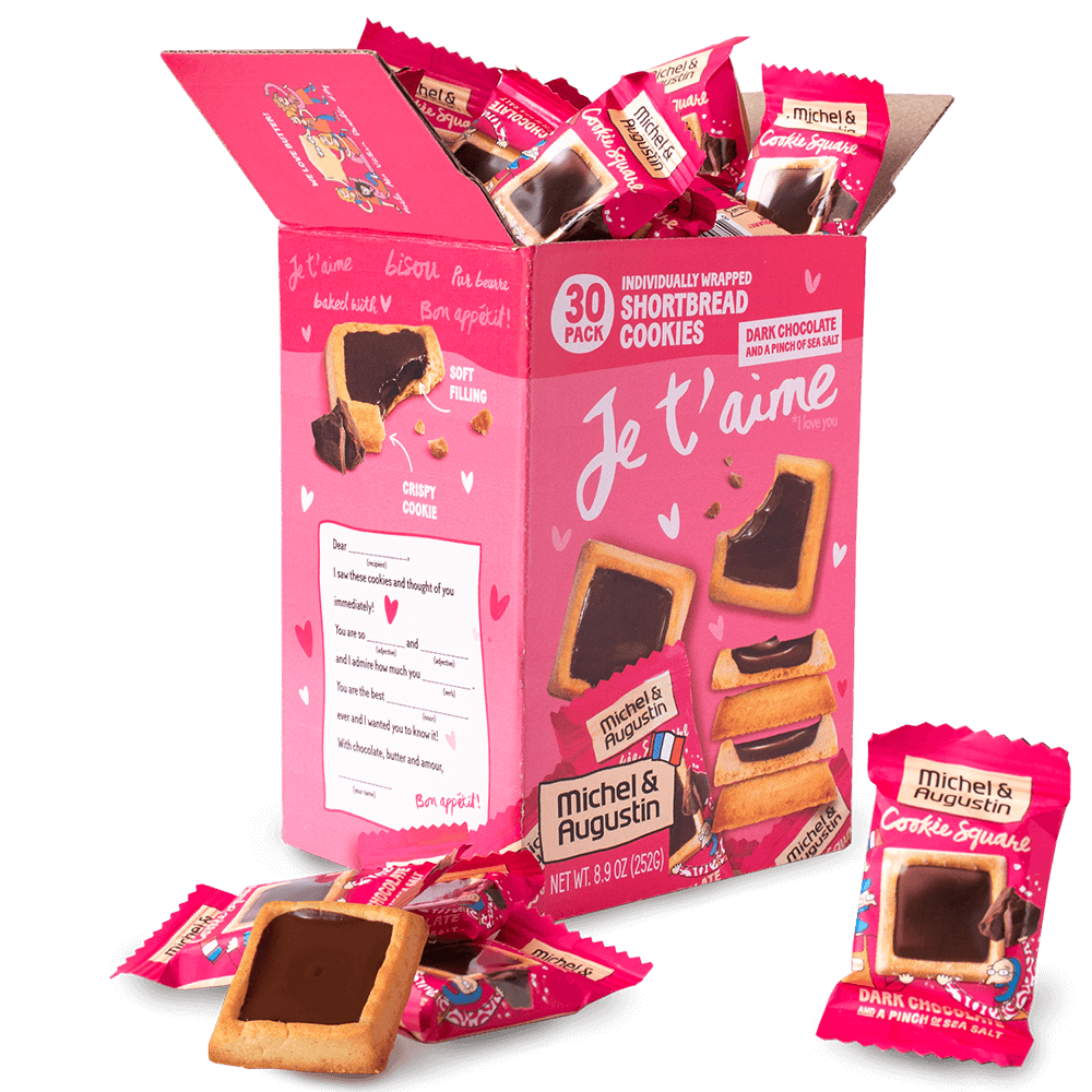 - 30 individually wrapped Dark chocolate cookies in a beautiful Valentine's Day box - ready to gift to your Valentine, Galentine, coworkers or classmates!